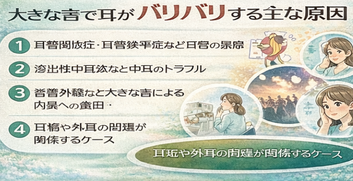 大きな音を聞くと バリバリに加えて、聞こえにくい、耳鳴りがする、耳が詰まった感じが続く場合は、来院を考えたい目安です。こうした症状は、耳管の異常だけでなく、音響外傷や中耳の問題でも起こりうるとされています。翌日まで残るなら、なおさら早めの相談が安心です。
