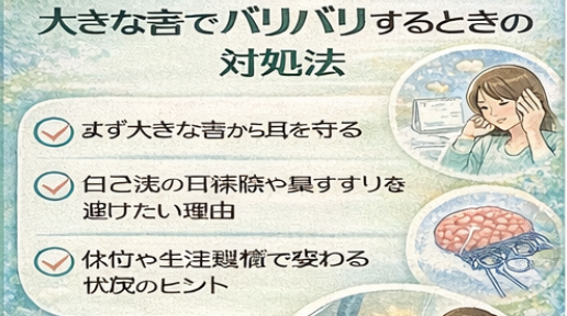 大きな音を聞くと バリバリする症状は、疲れている時期や寝不足の時期に強く感じる方もいます。上位記事でも、ストレスや疲労が関係するケースに触れているものが見られました。耳そのものの異常だけでなく、体全体が緊張しやすいと、ちょっとした音の刺激を強く感じやすくなることがあるようです。