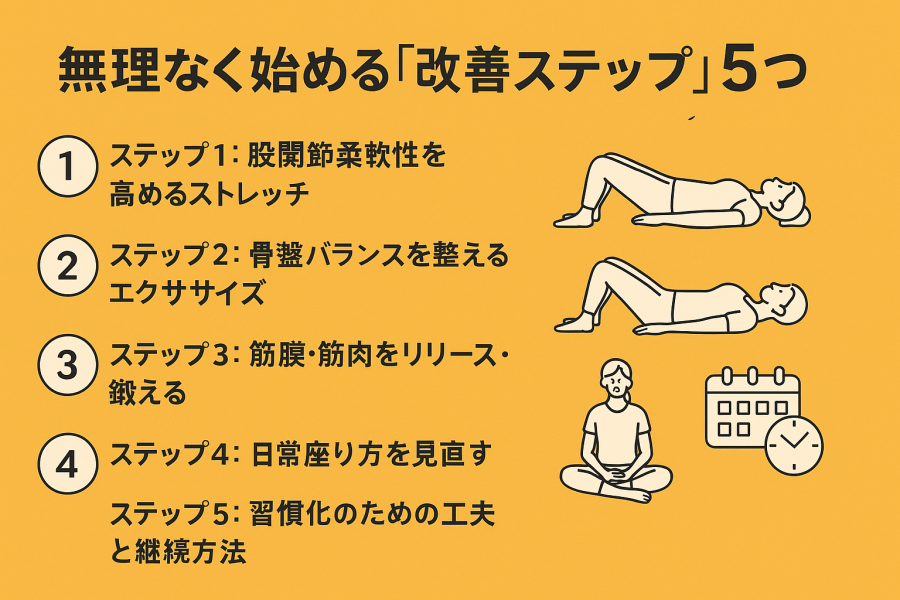 ステップ1:股関節柔軟性を高めるストレッチ(例:内旋ストレッチ、バタフライ、仰向け膝倒し)