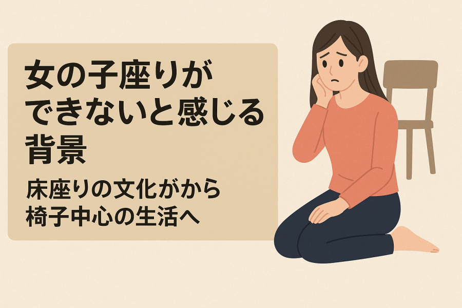 「女の子座りって、あの横に脚を流す座り方ですよね?」と、相談の場でよく耳にします。昔は畳やちゃぶ台の生活が中心で、床に座る機会が多かったため、この姿勢に慣れている人が多かったと言われています。しかし、今の生活を振り返ってみると、椅子・ソファが当たり前になり、床に座る場面そのものが少なくなっているとされています。