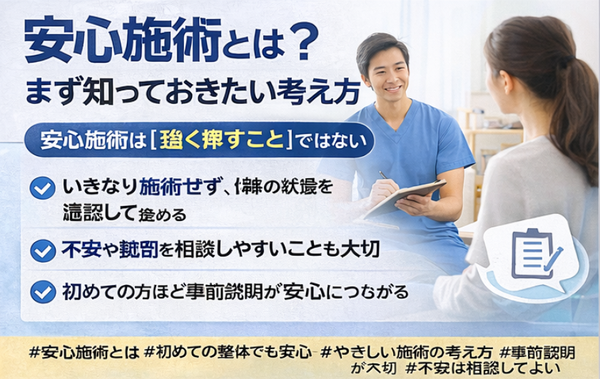 #安心施術とは #初めての整体でも安心 #やさしい施術の考え方 #事前説明が大切 #不安は相談してよい