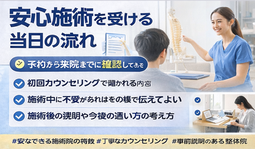 安心できる施術院のもう一つの特徴は、施術の内容や流れをあらかじめ説明してくれることです。参考記事や上位記事でも、初めての整体では「何をするのか」が見えることが安心につながると案内されています。受付、カウンセリング、体の確認、施術、施術後の説明という流れがわかるだけでも、来院前のハードルは下がりやすいようです。