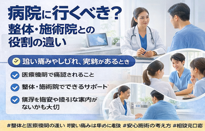 #整体と医療機関の違い #強い痛みは早めに相談 #安心施術の考え方 #整体でできるサポート #相談先の順番が大切