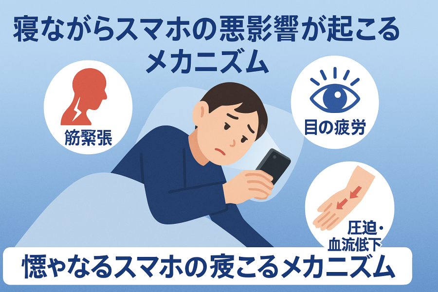 寝ながらスマホを使うと便利な一方で、体には無視できない負担が積み重なると言われています。特に姿勢や目の酷使、血流の停滞といった要因が複雑に関係しており、それが首や肩、さらには全身の不調につながる可能性があるとされています。ここでは、その仕組みを詳しく見ていきましょう。
