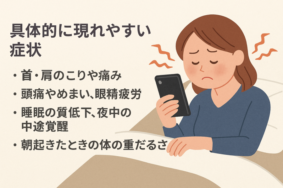 寝ながらスマホで首や肩を緊張させたまま眠ると、翌朝に体が重く感じやすくなります。これは筋肉のこりや血流不足によって疲労が回復しにくい状態が続いた結果だと考えられています。慢性的に続くと「寝ても疲れが取れない」と感じやすく、生活習慣の改善が求められるケースもあるようです。