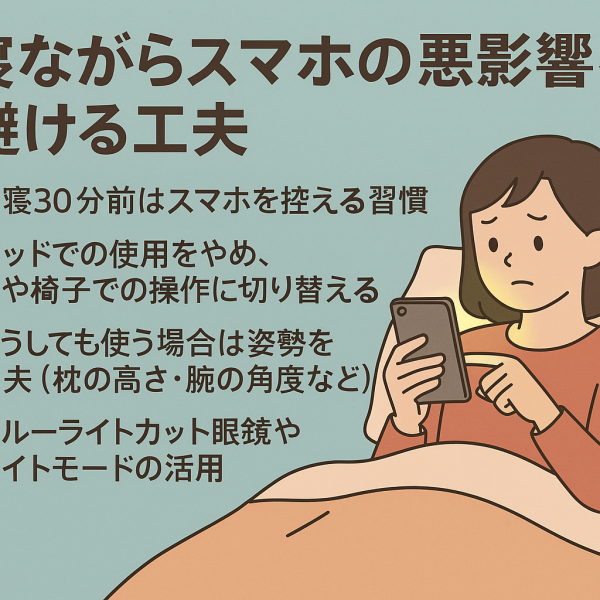 寝ながらスマホの悪影響を避けるためには、使用時間を制限し、姿勢や環境を工夫することが大切だと言われています。小さな意識の積み重ねが、首・肩・目・睡眠の健康維持につながります。