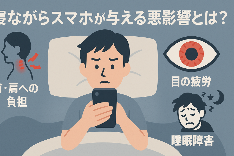 寝ながらスマホは便利ですが、首・肩・目・睡眠に悪影響を及ぼす可能性があると言われています。小さな不調が積み重なることで慢性化するリスクもあるため、日常生活で意識的に使い方を工夫することが大切です。