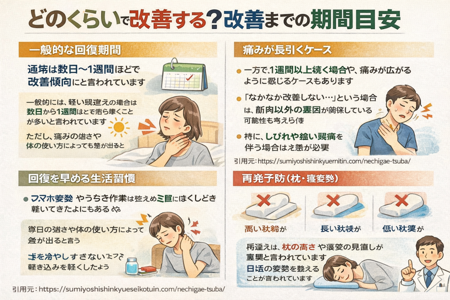 一般的には、軽い寝違えの場合は数日から1週間ほどで落ち着くことが多いと言われています。筋肉の軽い炎症が原因と考えられており、時間の経過とともに徐々にやわらぐケースが多いようです。