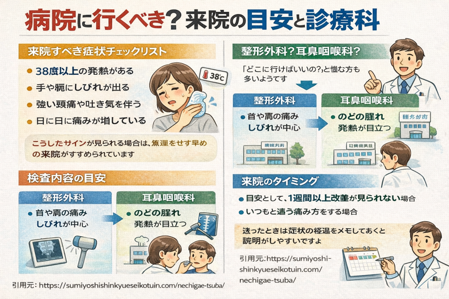 首を動かしたときの痛みやしびれが中心であれば、整形外科が選択肢になると言われています。一方で、強いのどの腫れや飲み込みづらさ、発熱が目立つ場合は耳鼻咽喉科が適しているケースもあるとされています。