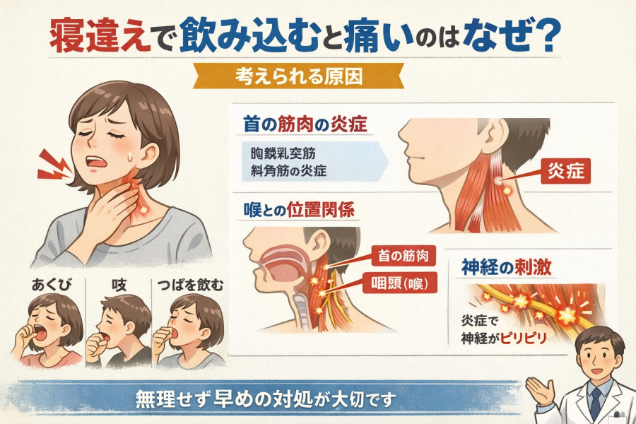 とくに胸鎖乳突筋や斜角筋は、首を回したり支えたりする大切な筋肉です。寝ている間に無理な姿勢が続くと、これらの筋肉が緊張し、小さな炎症が起こることがあります。その状態で飲み込む動きをすると、筋肉が引き伸ばされ、ズキッと違和感が出やすいと考えられています。