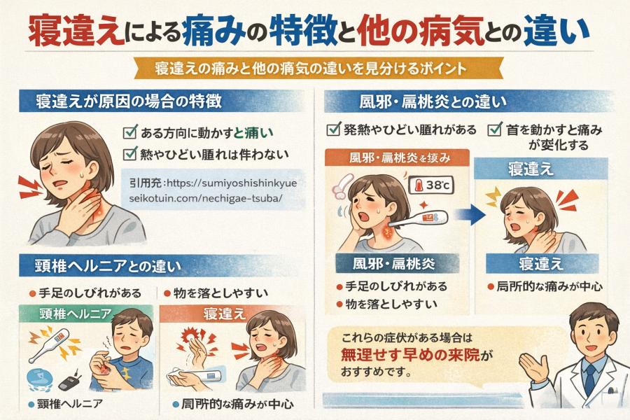寝違えでは、局所的な筋肉痛に近い症状が中心になることが多いとされています。ただし、自己判断は難しい場合もあるため、不安が続くときは専門家への相談がすすめられています。