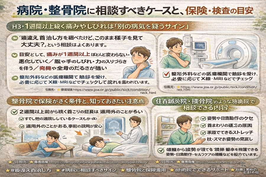 #寝違え首治し方 #病院に相談すべきサイン #整骨院と保険適用 #施術院でできるサポート #医療と整体の役割分担
