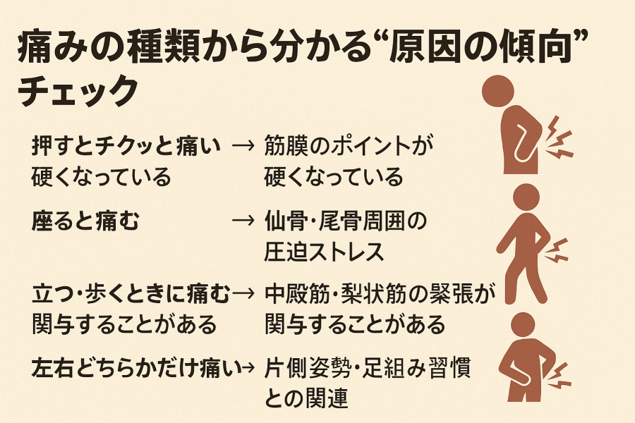 座ると痛む → 仙骨・尾骨周囲の圧迫ストレスの傾向