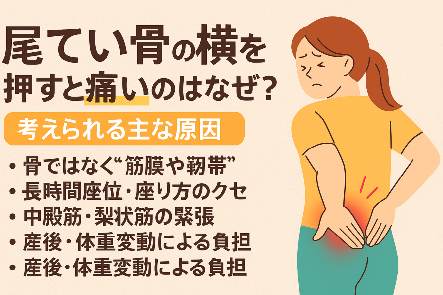 「ここ押すと痛いんだよね」と相談されると、周囲の筋膜や靭帯がこわばっていると言われています。尾てい骨の横には靭帯や筋膜が集中していて、長時間の座位で引っ張られやすい部分なんですね。「骨がずれている?」と不安になる方もいますが、筋膜の緊張で痛みを感じる例も多いようです。