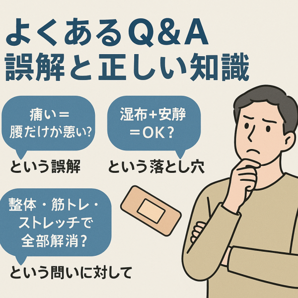よくある対処が湿布を貼って安静にすることですが、必要以上に休み続けると筋肉が弱まり、体が固まりやすくなると言われています(参考:整形外科領域の情報)。「楽な姿勢でいればよい」という考えだけでは、改善が遅れる場合もあります。