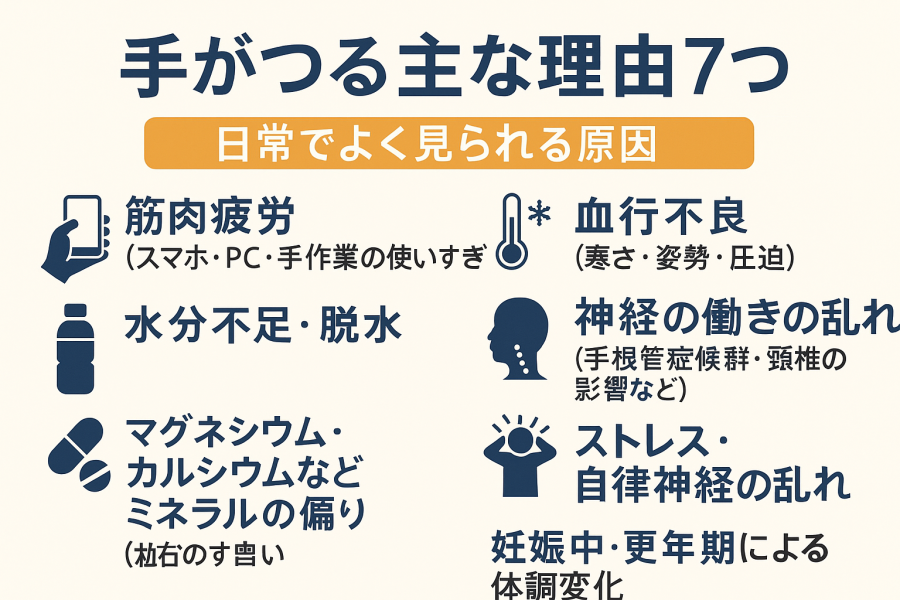 こうして並べてみると、手がつる理由は本当に幅広いんだな、と感じるはずです。