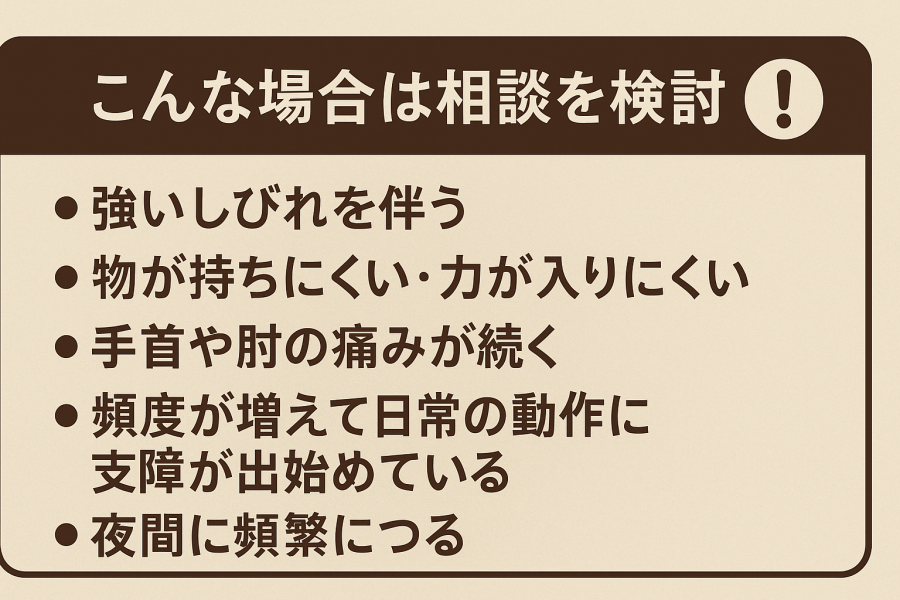 手がつること自体はよくある症状ですが、“いつもと違うサイン”が積み重なるときは、早めに相談することで安心を得やすくなると言われています。