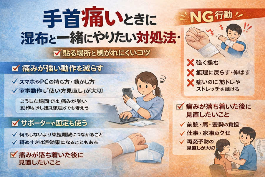湿布を貼っても変わらない場合は、「湿布が合っていない」というより、手首に負担をかける生活動作が続いていることも多いと言われています。スマホを長時間持つ、フライパンを片手で振る、キーボード作業が多いといった習慣が重なると、手首は休まりません。そのため、湿布とあわせてサポーターを使ったり、痛む動きを減らしたり、作業姿勢を見直したりすることが大切です。それでも改善しない、しびれや腫れが続く、転倒後から痛いという場合は、湿布だけで判断せず来院の目安を考える必要があるとも言われています。
