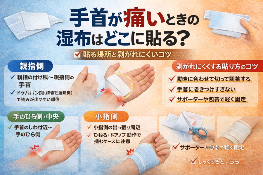 「手首が痛いけど、湿布ってどこに貼ればいいの?」と迷う方は多いですよね。実際は、手首全体に何となく貼るよりも、痛みが出やすい場所に合わせて位置を調整するほうが使いやすいと言われています。たとえば親指側が痛いのか、手のひら側なのか、小指側なのかで、負担がかかっている部分は少しずつ変わります。貼る場所がずれると、湿布の成分が届いてほしい部分から外れたり、動かすたびに剥がれやすくなったりすることもあります。また、手首は日常的によく動くため、大きい湿布をそのまま巻きつけると浮きやすいとも言われています。まずは「一番痛いところ」と「その周辺の動くライン」を意識しながら貼るのがコツです。なお、しびれや強い腫れ、ぶつけたあとの痛みがある場合は、湿布だけで様子を見るのではなく、別の原因も考えることが大切とされています。