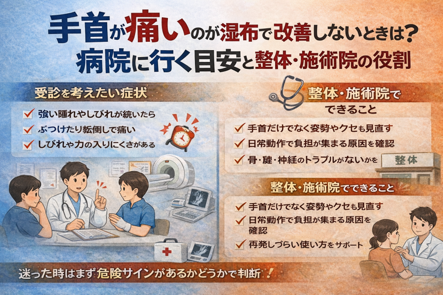 手首が痛いとき、まず湿布で様子を見る方は多いですよね。ただ、湿布を使っても痛みが続く、むしろ強くなる、しびれまで出てくる場合は、いったん「使いすぎ」以外の原因も考えたほうがよいと言われています。特に、強い腫れ・熱感・赤みがある、転倒やぶつけた後から痛い、力が入りにくい、夜もズキズキして眠れないといった症状は、早めに医療機関へ相談したいサインとして案内されています。医療機関では、どこを動かすと痛いか、腫れや変形がないかを確認し、必要に応じてレントゲン、超音波、MRIなどで骨・腱・神経の状態をみることがあるようです。一方、整体・施術院では、手首だけでなく前腕や肘、肩、姿勢、日常の使い方まで含めて負担の偏りを整理し、再発しにくい体の使い方をサポートする役割があると言われています。迷ったときは、まず危険サインの有無を目安に考えると整理しやすいです。