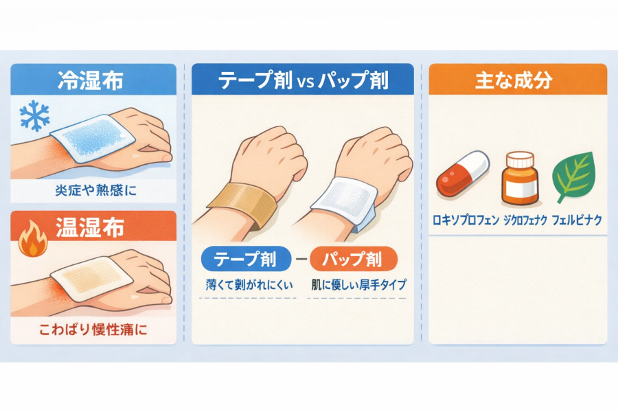 湿布の種類と選び方(冷湿布 vs 温湿布/テープ剤 vs パップ剤)