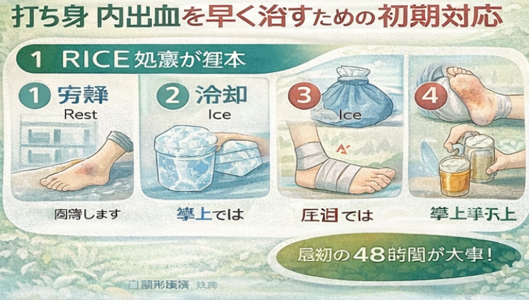 打ち身 内出血 早く治すための初期対応として、まずよく紹介されるのがRICE処置です。RICEとは、安静・冷却・圧迫・挙上の頭文字をとった考え方で、スポーツ外傷や打撲の初期対応でよく使われています。ぶつけたばかりの時期は、患部を無理に使わず、まずは落ち着かせることが基本とされています。何か特別なことをするより、悪化させない初動が大事なんです。