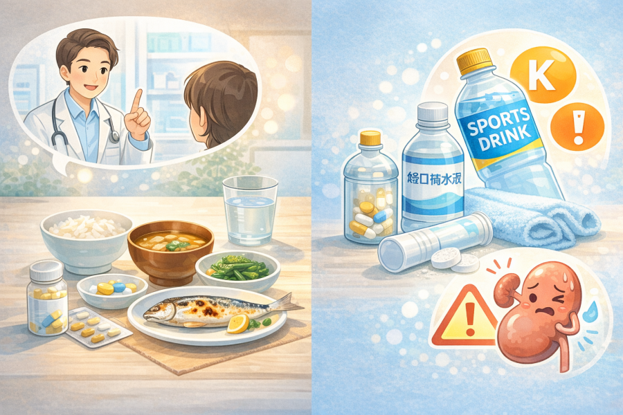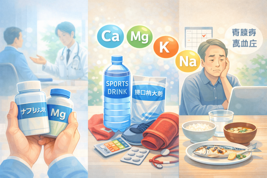 そのため、持病や服薬がある方は、「指がつるから」という理由だけでミネラル補給飲料を増やすのではなく、必ず主治医や薬剤師に相談してから量や種類を決めることがすすめられています。