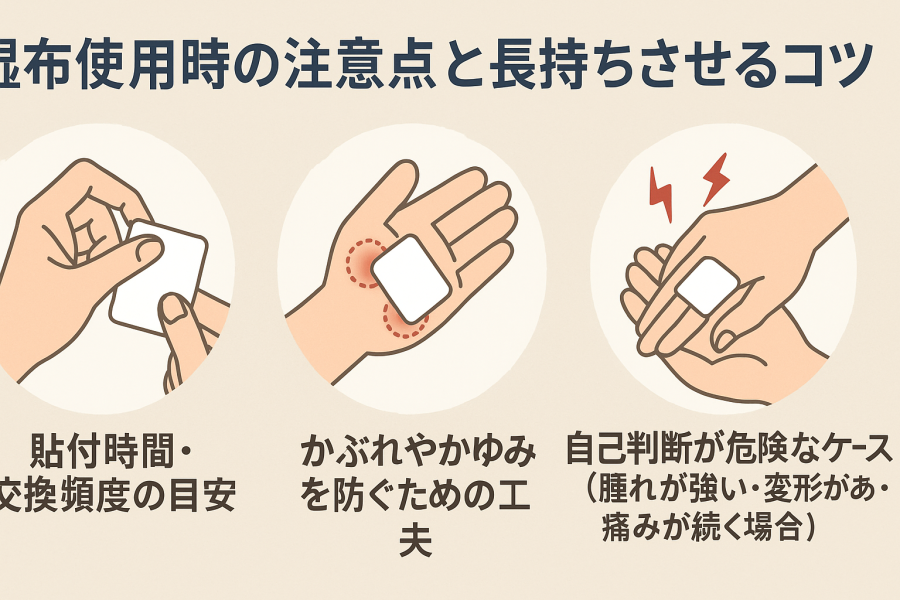 湿布を使う際に心配なのが「かぶれ」や「かゆみ」です。貼る前に皮膚を清潔にしてから使用すると、粘着剤によるトラブルを減らせるとされています。汗をかいた直後や入浴後にすぐ貼ると、肌が敏感になっているためかゆみが出やすいので、少し時間をおいてから貼ると安心です。また、長期間同じ場所に繰り返し貼ると赤みが出やすいので、貼る位置を少しずらすのも工夫の一つです。肌が弱い方は、貼付部に保護用のテープやガーゼを間に挟むという方法もあります。