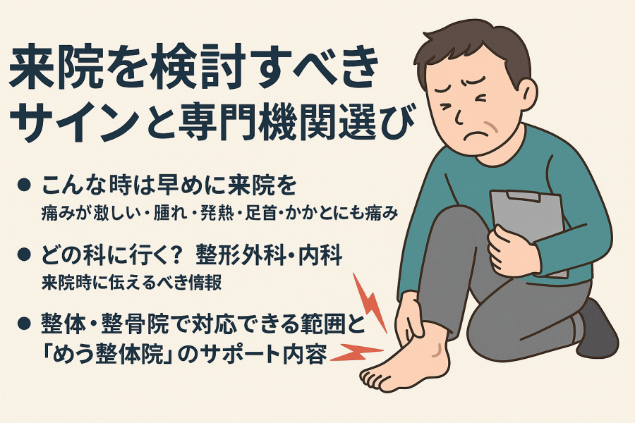こんな時は早めに来院を(痛みが激しい・腫れ・発熱・足首・かかとにも痛み)