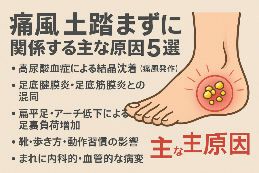 まれに内科的・血管的な病変(=痛風以外の重篤疾患) → 土踏まずの痛みで内臓・血管の異常が隠れているケースも。