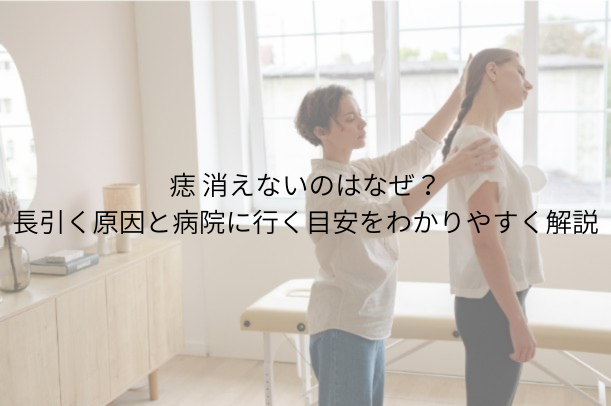 一般的な打撲の痣なら少しずつ変化していくことが多いため、2〜3週間たってもほとんど見た目が変わらない場合は、来院を考えたい目です。特に1か月近く残るようなら、自然な経過と言いにくいケースもあります。痣 消えないと感じたら、期間は大きな判断材料になります。