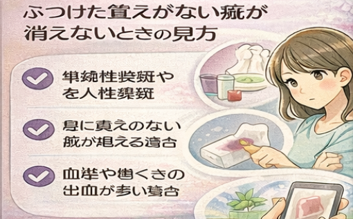 痣 消えないだけでなく、新しいあざが増えてくる場合は、少し注意して見たいです。軽い内出血が続いているだけのこともありますが、血液や止血機能に関わる異常が背景にあることもあります。特に複数の場所に同時に出る、広がるスピードが速いというときは、自己判断だけで済ませないほうが安心です。