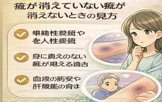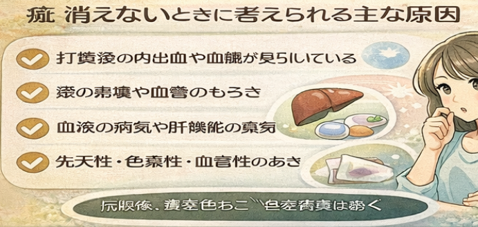 そもそもそれが打撲の痣ではなく、色素や血管の変化による“あざ”である可能性もあります。こうしたあざは自然に消えにくく、経過の中で少しずつ目立ち方が変わることはあっても、短期間では大きく変わりにくいことがあります。ぶつけた覚えがなく、ずっと同じ場所にある場合は、この視点も必要です。