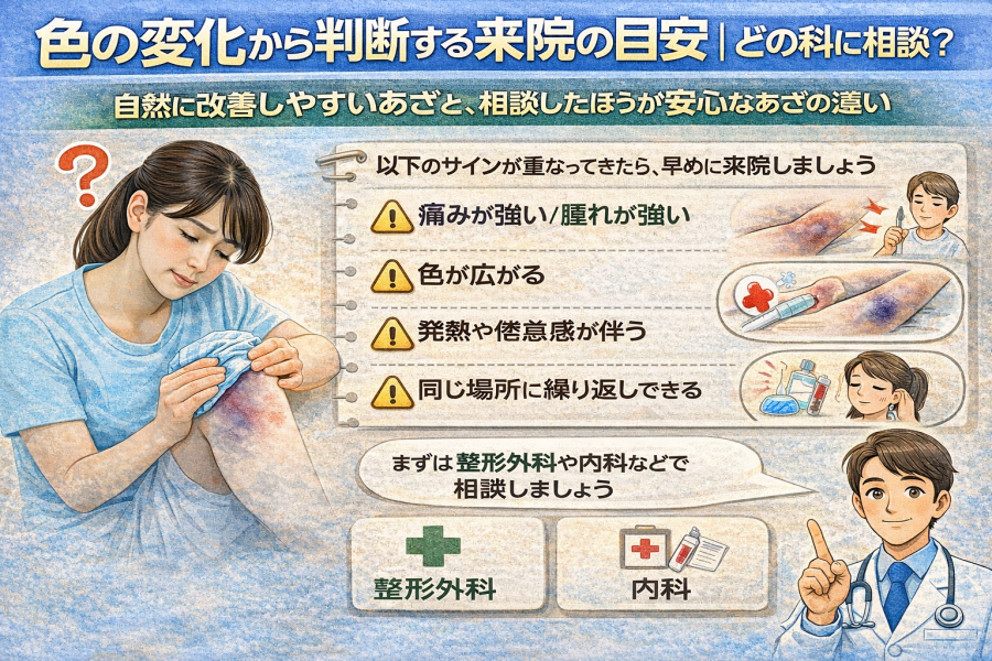 こんな不安を抱えたまま、なんとなく放置してしまう方も多いですよね。一般的には、皮下出血の色は時間とともに赤→紫→青→緑→黄色へと移り変わり、数日〜数週間で目立たなくなりやすいと言われています。ただ、その流れから外れているように感じる時は、来院を考えるサインになることがあると説明されています。