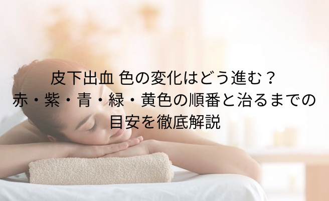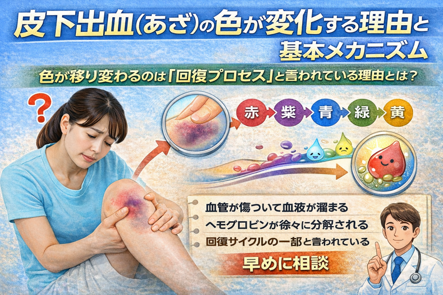 こんなふうに不安を話されることがあります。実は、皮下出血の色が変わっていくのは、体がゆっくりと回復しているサインだと説明されることが多いんですね。「え、色が変わるって逆に悪いことじゃないの?」と感じる方もいますが、その仕組みを知ると少し安心できるかもしれません。