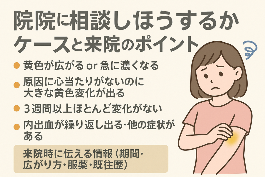 皮膚の一部が黄色く見える理由はさまざまですが、状況によっては相談したほうが安心につながるケースもあると言われています。
