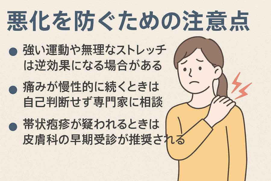 肋間神経痛は、放置したり誤った対処を行うと症状が長引くことがあると言われています。特に痛みがある状態で無理をすると、体の回復を妨げてしまう可能性があるため注意が必要です。ここでは、悪化を防ぐために意識しておきたいポイントを整理します。