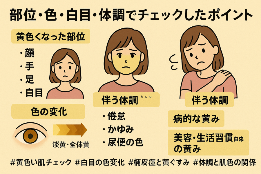 色の変化(淡黄→濃黄→全体黄)や伴う体調(倦怠・かゆみ・尿便の色)で注意すべきサイン