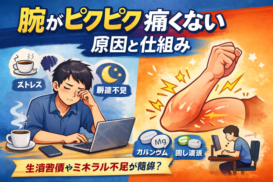 特にマグネシウムやカルシウムは、筋肉の動きを調整する役割があると言われています。不足すると、筋肉が過敏になりピクピクしやすくなる可能性があるそうです。