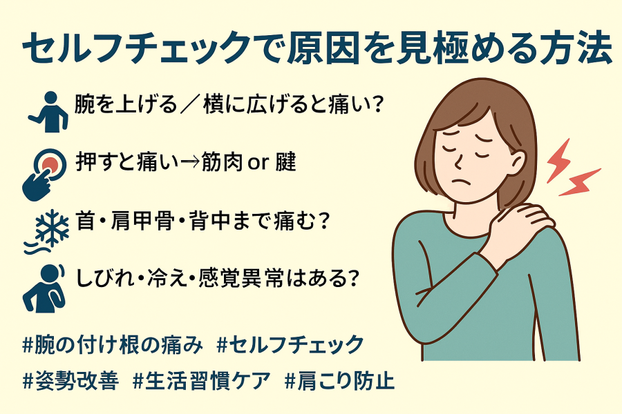 腕の付け根の痛みは、一見すると肩や首のこりと混同しやすいですが、痛みの出方や動き方の違いを観察することで、ある程度の原因の目安をつけることができると言われています。ここでは、自宅でも簡単に行えるセルフチェック方法を紹介します。