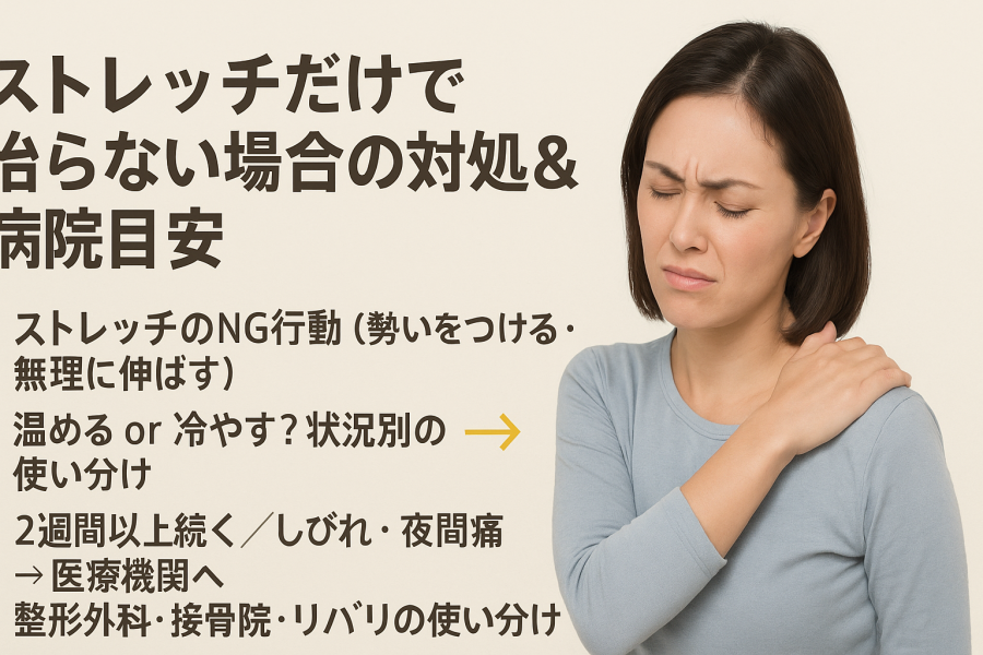 「痛いとき」と「痛みが落ち着いたとき」でストレッチを使い分けることで、悪化を防ぎながら効率よく改善すると言われています。もしストレッチ中に痛みが強まる場合は無理せず、整体や整形外科でチェックを受けることが大切です。