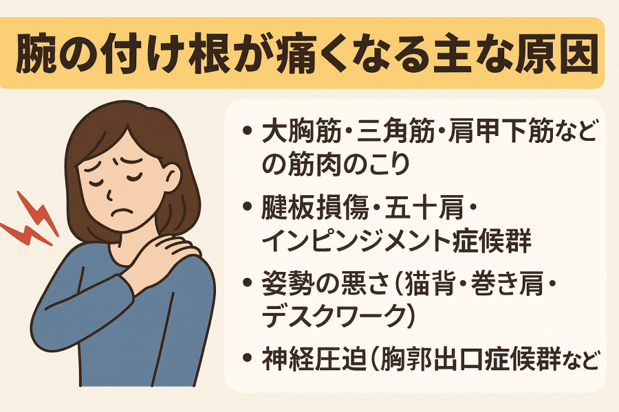 腕の付け根の痛みは、一見「肩こり」と思われがちですが、実際には筋肉・腱・関節・神経など、複数の要素が関わっていると言われています。特に、デスクワークやスマートフォン操作など、日常的な動作の積み重ねが原因になるケースが増えています。ここでは代表的な要因を整理して紹介します。