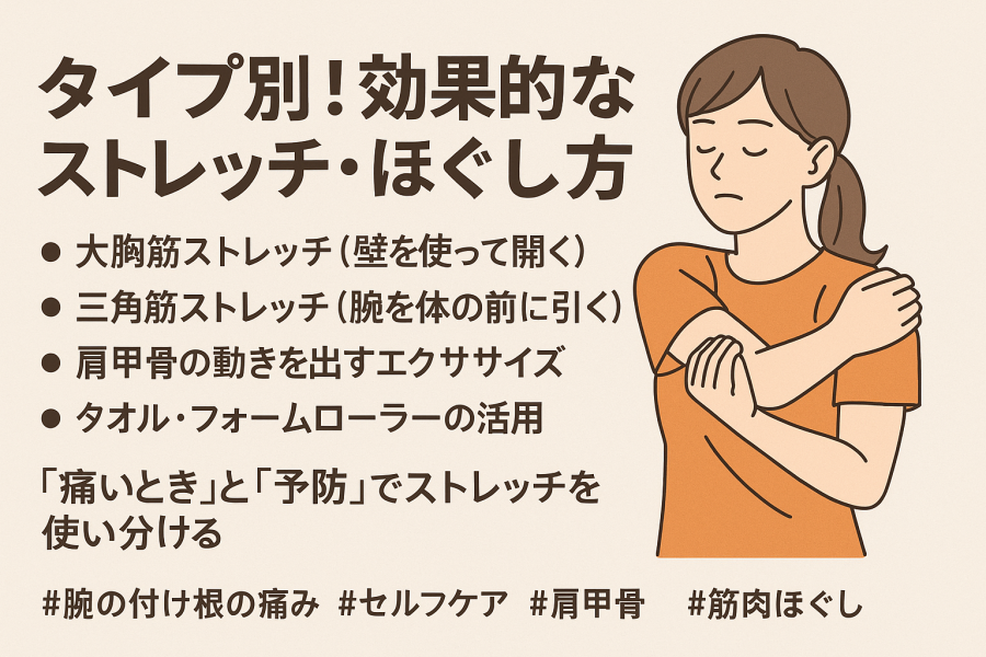 腕の付け根が痛いとき、「とりあえずストレッチすればいい」と思いがちですが、実は“どこが原因なのか”によって効果的なストレッチは変わると言われています。ここでは筋肉のタイプ別に、簡単にできるストレッチやほぐし方を紹介します。