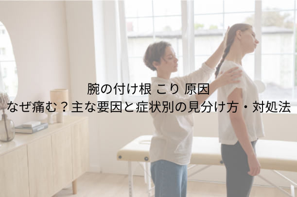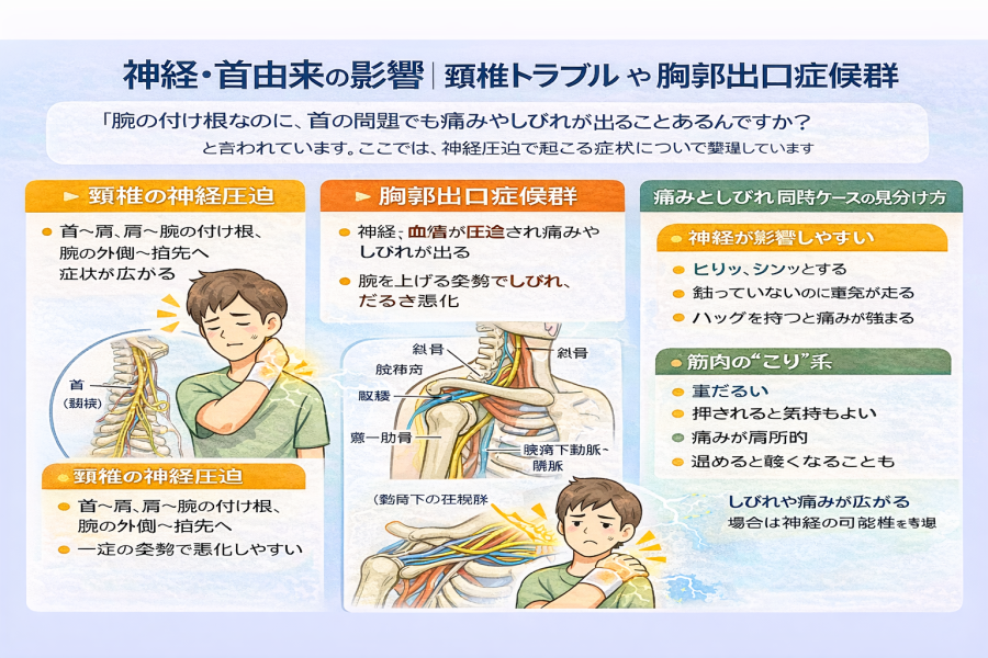 こうした質問はとても多いです。腕の付け根は肩関節だけでなく、首から伸びる神経の影響も受けやすい場所だと言われています。筋肉のこりとは違い、痛みとしびれがセットで出るケースもあるため、感じ方の違いがヒントになることが多いようです。