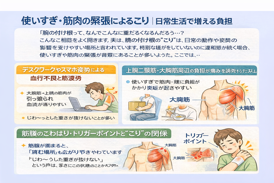 こんなご相談をよく聞きます。実は、腕の付け根の“こり”は、日常の動作や姿勢の影響を受けやすい場所と言われています。特別な怪我をしていないのに違和感が続く場合、使いすぎや筋肉の緊張が背景にあることが多いようです。