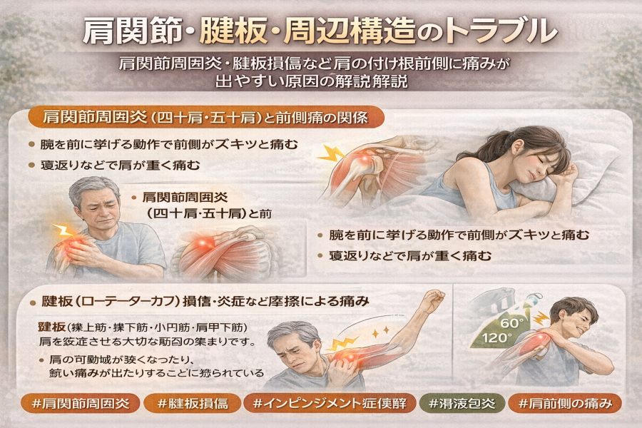 リハサクの記事でも、肩関節周囲炎は肩前部・側方・上腕の痛みに広がりやすいと説明され、肩の周りの炎症が前側痛につながりやすい理由が解説されています。