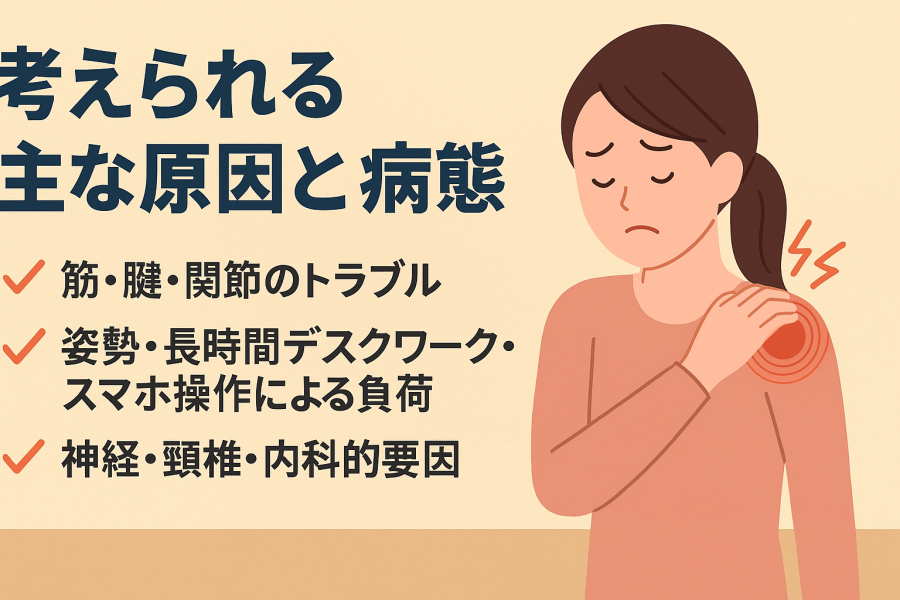 整体・クリニックの観点から言うと、筋肉・筋膜・姿勢のゆがみ・肩甲骨まわりの動きの硬さが痛みの背景になっていることが多いと言われています。