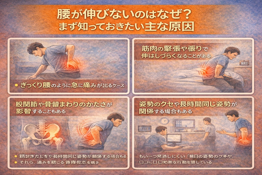 腰が伸びない原因は、急な痛みだけとは限らないようです。参考記事では、慢性腰痛のように腰や骨盤まわりの筋肉がいつも緊張している状態でも、腰をまっすぐに伸ばしにくくなることがあると案内されています。特に、朝起きたときや長時間同じ姿勢でいたあとの動き始めで、腰がつっぱるように感じるケースは少なくないと言われています。いきなり激痛ではなくても、「なんとなく伸びない」「伸ばそうとすると怖い」と感じるなら、筋肉の張りが背景にあることも考えられそうです。