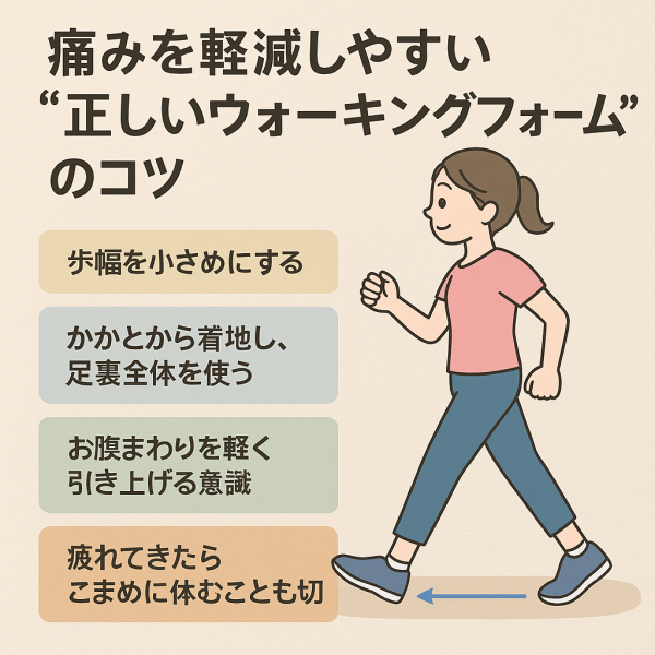 歩幅を控えめにすることで、腰椎まわりの反りが強く出にくいと考えられています。特に、痛みが出やすい日は“気持ち小さめ”を意識するだけでも負担が変わりやすいです。