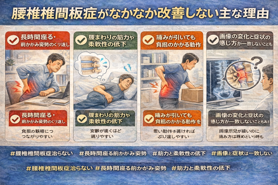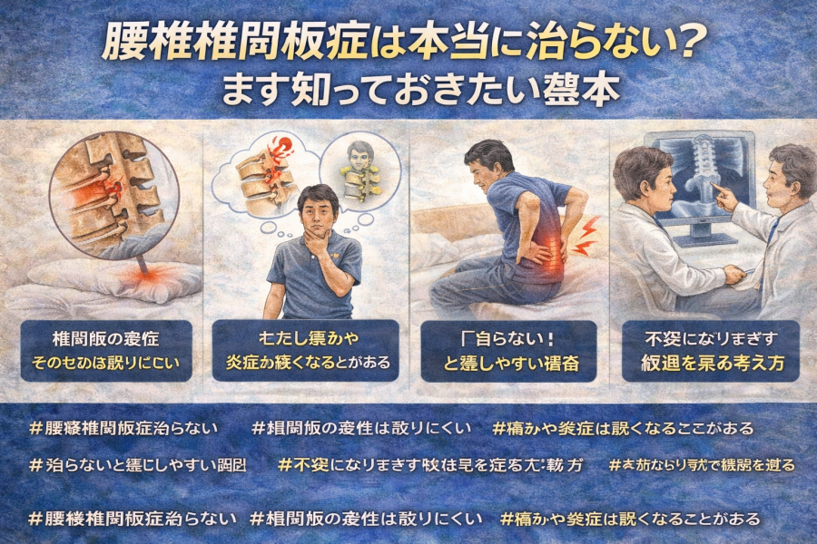 では、なぜ腰椎椎間板症は「治らない」と感じやすいのでしょうか。